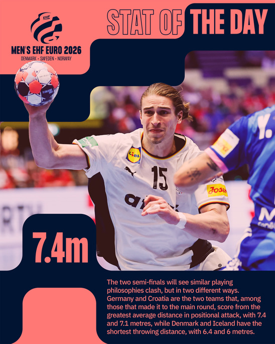 We're now an hour from throw-off for the 5/6 placement match, but the stat of the day looks ahead to the semi-finals. Julian Rux says: "The two semi-finals will see similar playing philosophies clash, but in two different ways. Germany and Croatia are the two teams that, among those that made it to the main round, score from the greatest average distance in positional attack, with 7.4 and 7.1 metres, while Denmark and Iceland have the shortest throwing distance, with 6.4 and 6 metres."