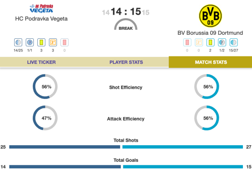 Could the debutants Dortmund be on the way to their first points? The German side are showing strong form and head to the break with a one-goal edge over Podravka, following a stand-out half for Alina Grijseels, who led with six goals.